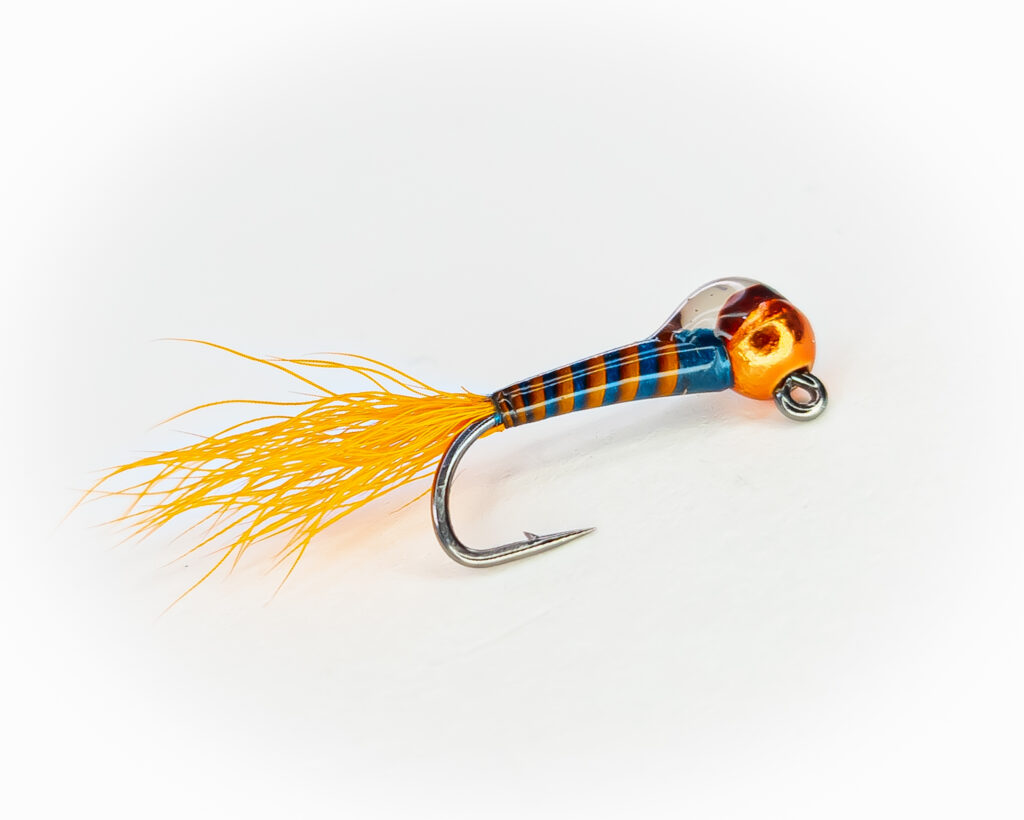 LL’s Perdigon Torch Hook: Daiichi 4647 Size 16 Bead: MFC Slotted Tungsten Lucent Bead-Orange Thread: Uni 6/0w-Doc Blue Tail: Calftail-Orange Body: Veniard Stripped Quill-Orange UV: Solarez Bone Dry Wingcase: Solarez Thick/Hard and Solarez UV Fly Finish-Black Featured in “End of the Line” in the Summer 2021 issue of Fly Fusion